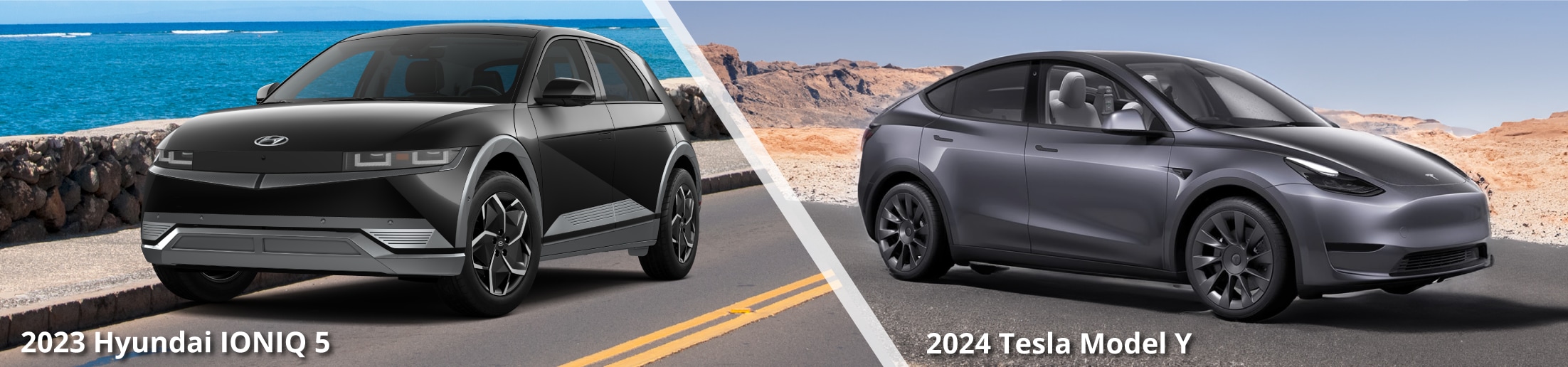 Disclaimer: The comparison made in this advertisement between the Hyundai Ioniq and Tesla vehicles is based on available data and our own observations. Individual experiences may vary, and factors such as driving conditions, personal preferences, and regional differences may impact the performance and features of each vehicle. For more information about the 2023 Hyundai Ioniq 5 visit https://www.hyundaiusa.com/us/en/vehicles/ioniq-5 . For more information about the 2024 Tesla Model Y visit https://www.tesla.com/modely . Prospective buyers are encouraged to conduct their own research and consult with automotive experts before making a purchasing decision. This is not sponsored or endorsed by Hyundai or Tesla, and all trademarks belong to their respective owners.